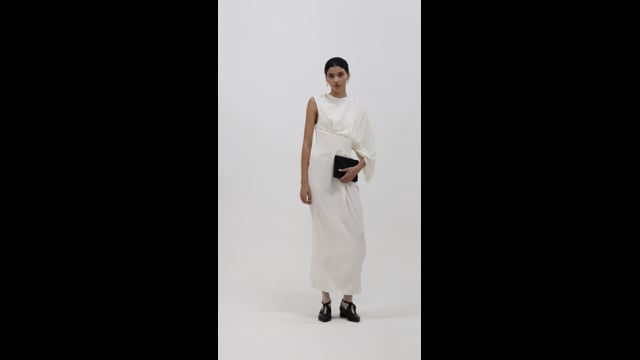 O Vestido Néli se revela na beleza da assimetria, um gesto que une estrutura e suavidade. De um lado, a manga fluida com pregas esculturais, desenha a silhueta e confere movimento, do outro, a cava curta valoriza com sutileza o contorno do ombro, criando um equilibrio sofisticado entre leveza e força. Confeccionado em crepe de alta qualidade, leve e fresco, o Vestido Néli acompanha com naturalidade os movimentos da mulher contemporânea, a saia retoma o ritmo das pregas da manga, reforçando a fluidez da peça, enquanto a fenda lateral suavemente contorna o corpo, proporcionando liberdade e conforto ao caminhar. O fechamento por botão forrado do mesmo tecido, nas costas, garante elegância e contribui para uma melhor vestibilidade.